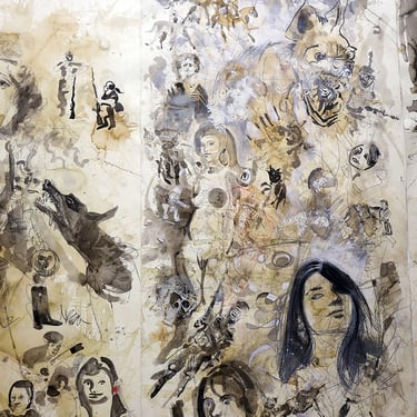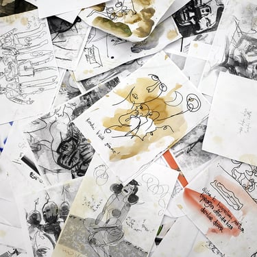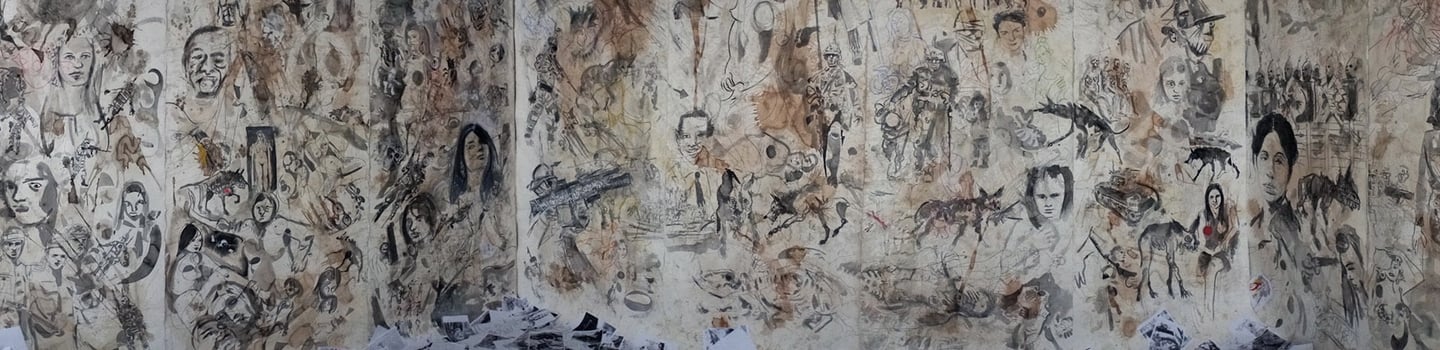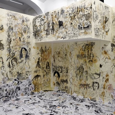 The spatial installation consists of large-format drawings and around 10,000 duplicates, some of which are colored. The drawings are attached to the wall (wallpapered), the duplicates lie on the floor like weightless leaves in autumn. The current chaotic state of the world is shown from the perspective of a rat that lives in a coffin and transmits the gaze of its circling eyes to us live.